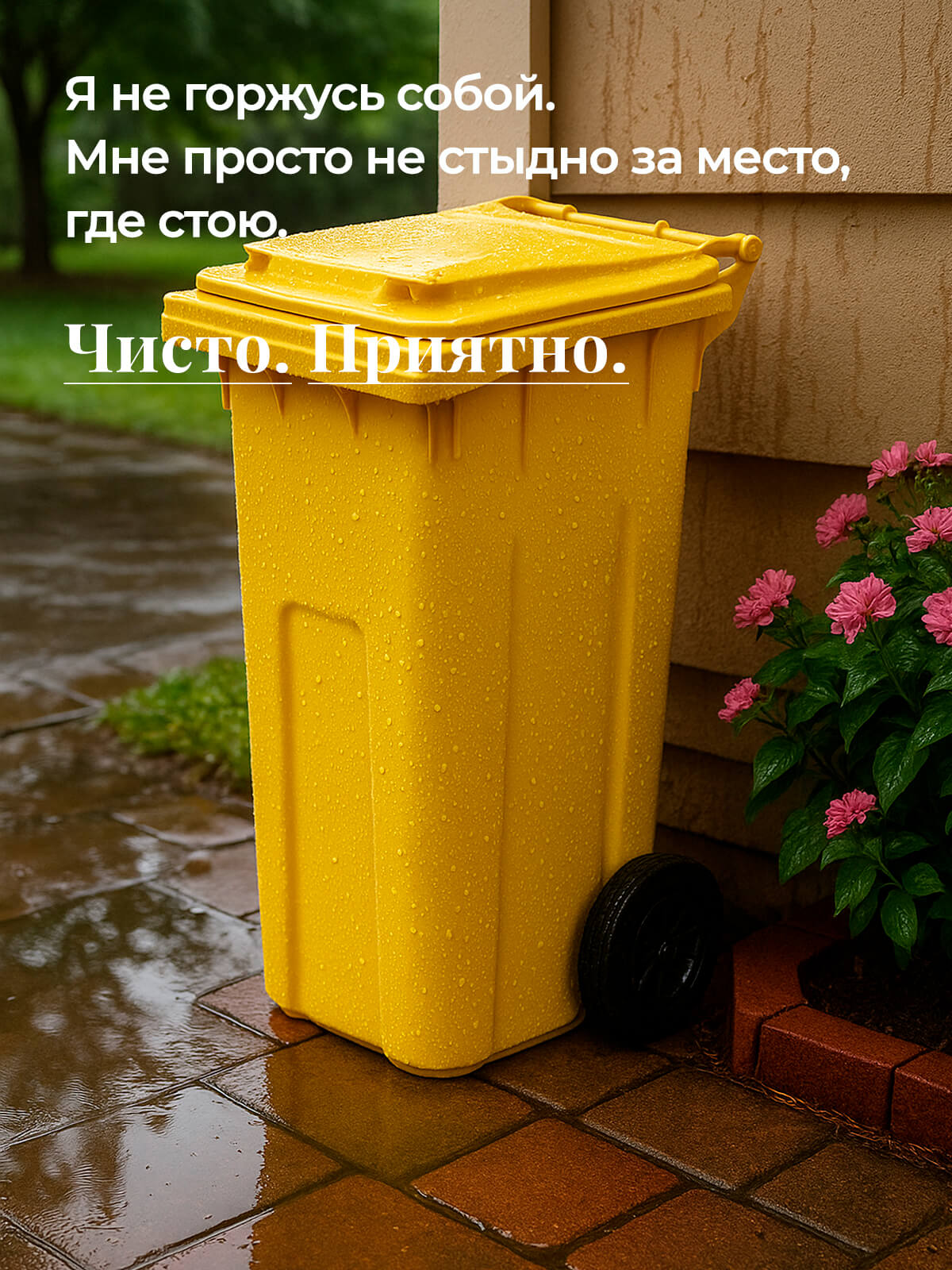 Благодаря прочным колёсам контейнер легко перемещается по любой поверхности. Корпус из первичного ПНД выдерживает морозы, удары и воздействие ультрафиолета, а плотная крышка надёжно удерживает запахи и защищает от осадков.